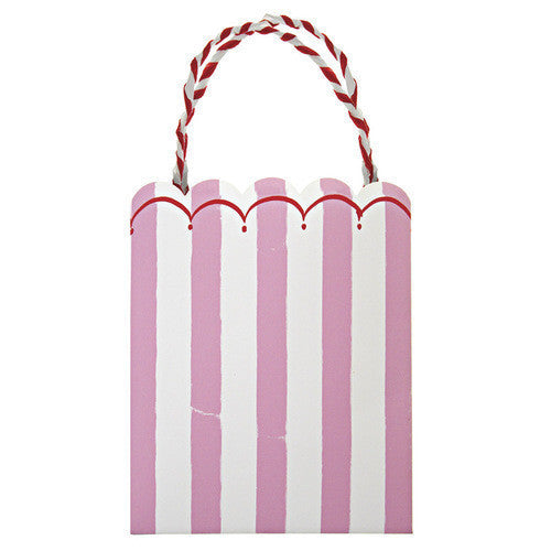 This pastel pink party bag will fit the bill at a range of party celebrations, from a little girl's birthday party to a more formal occasion. It is styled with a scallop edge and has bright, stripy string handles.